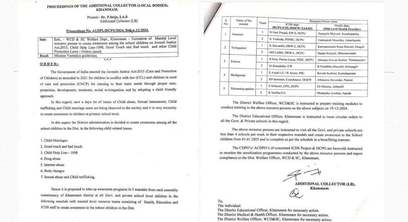 - WCD & SC Department team (DCPU/DHEW/CHL/SAKHI): Shares Child Helpline details, child rights legal information, and modules on critical issues like child marriages, safe touch/unsafe touch, child trafficking, and internet abuse.